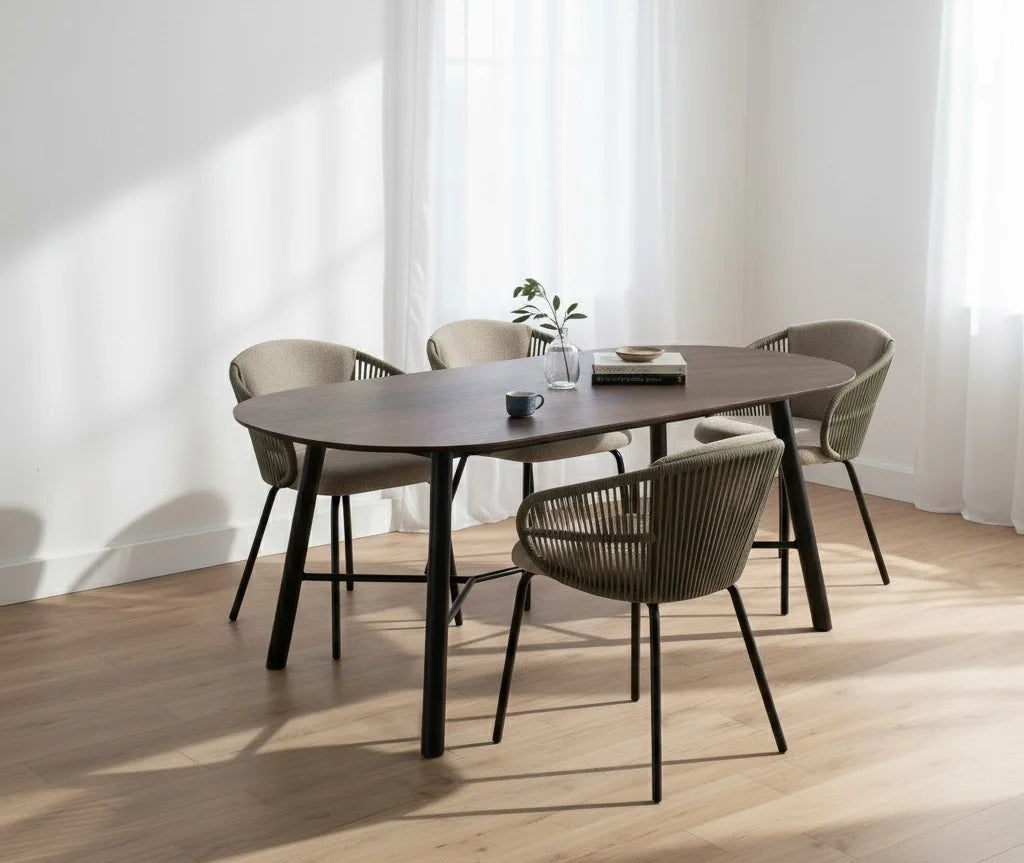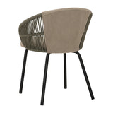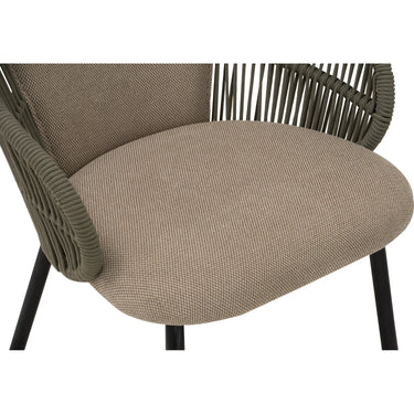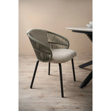 Atlas dining chair in Matt Black Epoxy leg, arm with Green colour Olefin rope, Olive Grey colour Devoir fabric chair seat and back. The Atlas Dining Chair is a striking fusion of Mid-Century Modern and Contemporary design, offering a unique seating experience. Supported by sturdy metal legs in matte black epoxy, the chair is accented with olefin rope arms in green for added texture and style. Upholstered in Devoir fabric in Olive Grey, the seat delivers comfort with a refined finish. Its generous proportions and supportive form make it ideal for long dining occasions, whether in homes, restaurants, or boutique hospitality settings. The Atlas Dining Chair stands out as a statement piece that balances durability, comfort, and sophisticated design.