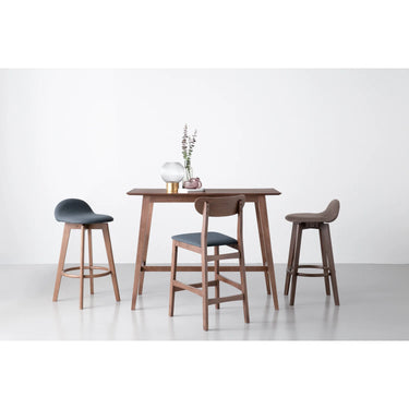 Crafted with precision in Malaysia, the Bar Chair Mora seamlessly combines high-quality craftsmanship with a stylish modern design. The chair legs in 109 Cocoa exude warmth and richness, while pairing seamlessly with the fabric seat in 6367 Navy. As a result, this color scheme creates a sophisticated look for dining rooms or kitchens.