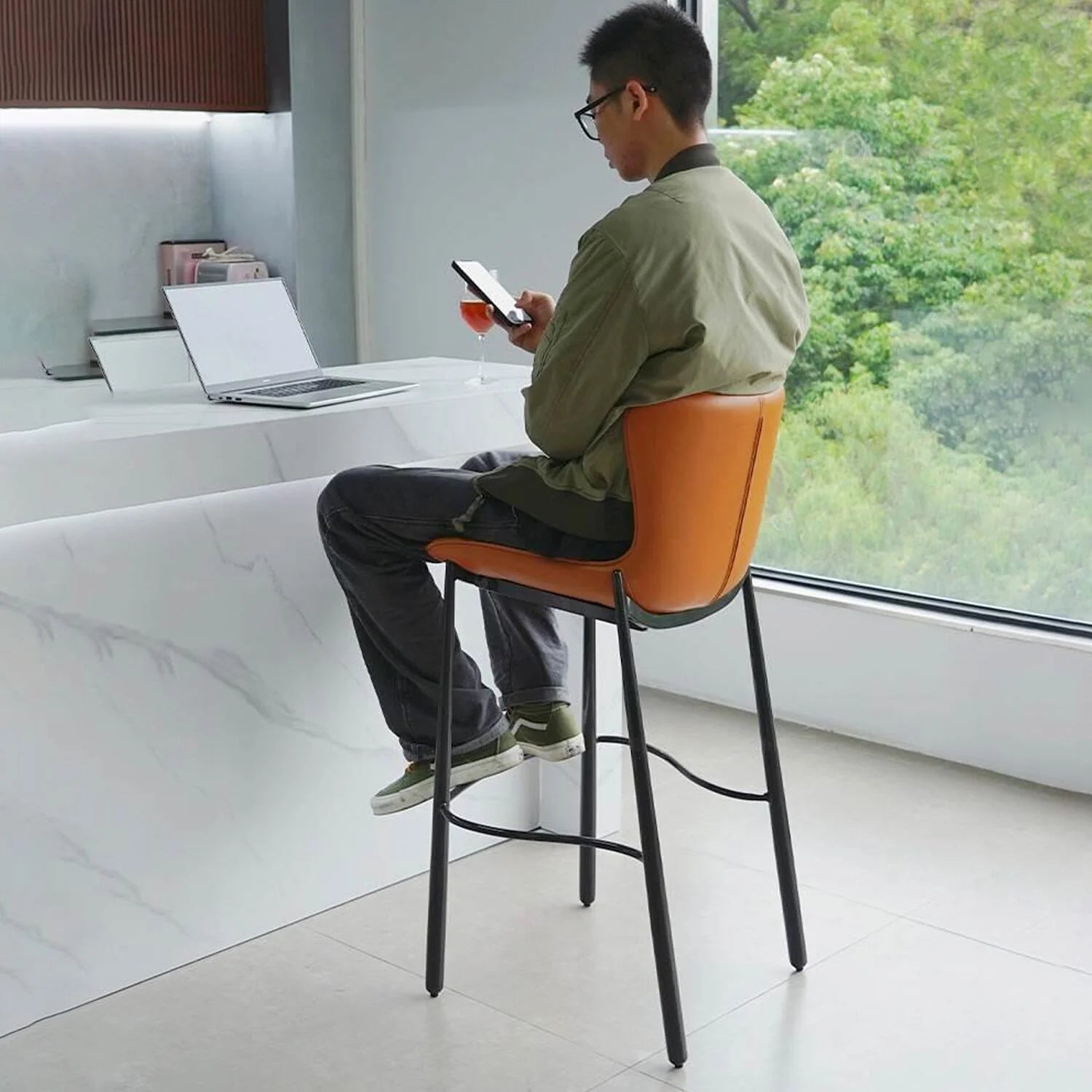 Designed for high counters and bar settings, this modern bar stool features a curved backrest and 50D high-density rebound sponge for long-lasting comfort and support. Upholstered in breathable PU leather, it’s soft, flexible, and easy to maintain.