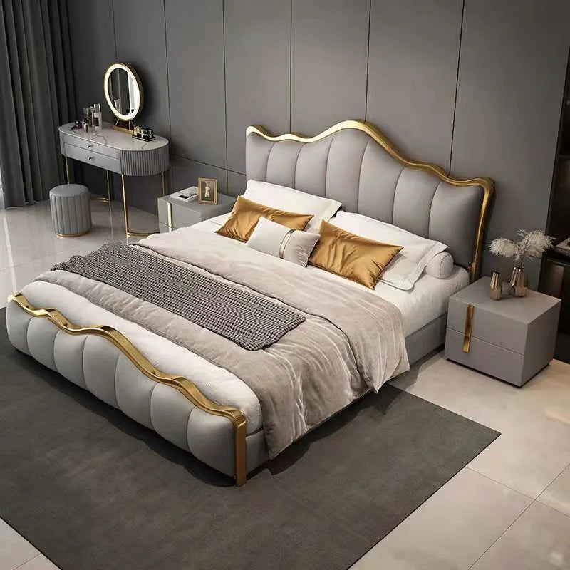 The elegantly curved silhouette showcases artistic craftsmanship, creating a sophisticated focal point in any bedroom. Accented with gold metal-plated detailing, the Frances Bedframe exudes modern luxury while offering resistance to wear, corrosion, and fading—ensuring its beauty lasts for years to come.