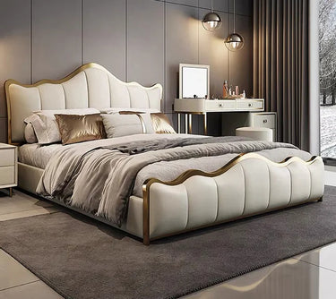 The elegantly curved silhouette showcases artistic craftsmanship, creating a sophisticated focal point in any bedroom. Accented with gold metal-plated detailing, the Frances Bedframe exudes modern luxury while offering resistance to wear, corrosion, and fading—ensuring its beauty lasts for years to come.