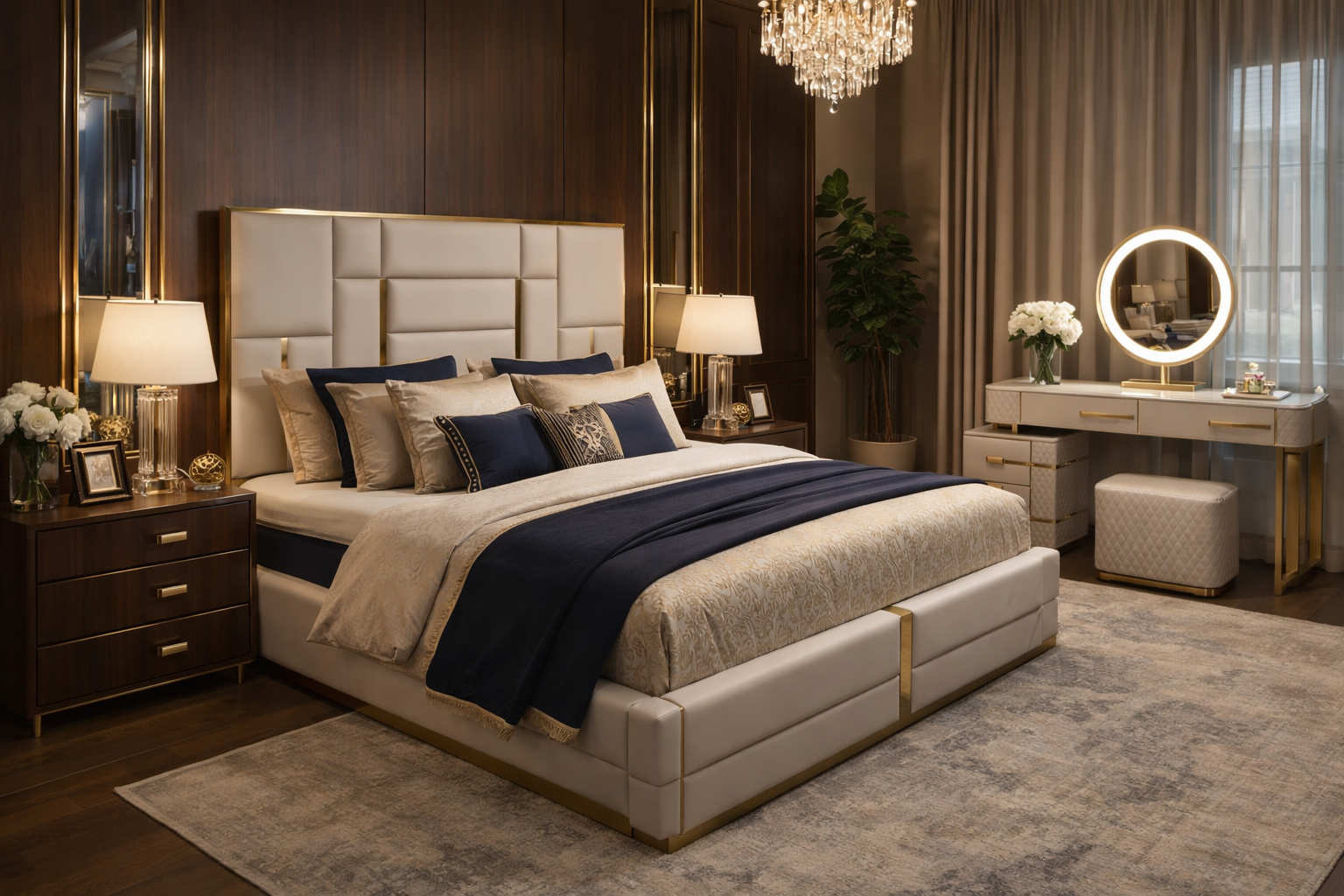 Elegant Aesthetic: Curved headboard, gold highlights, and refined stitching