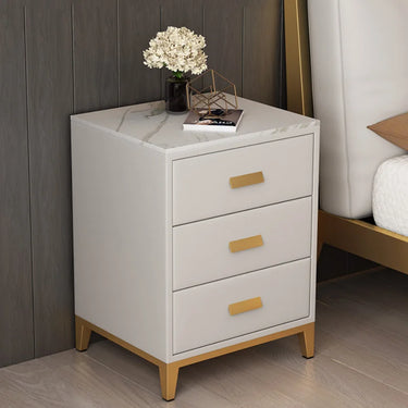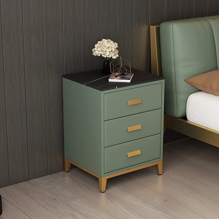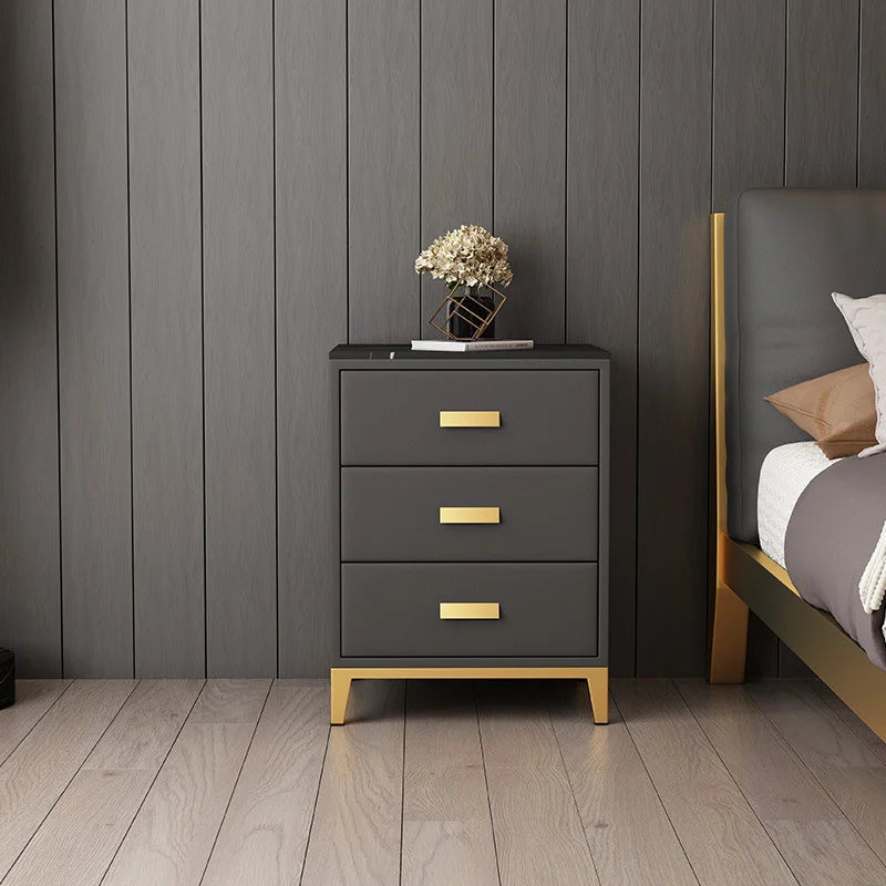 Finished in premium sleek leather, complemented by gold stainless-steel legs and solid oak wood cabinetry for a luxurious, durable build.