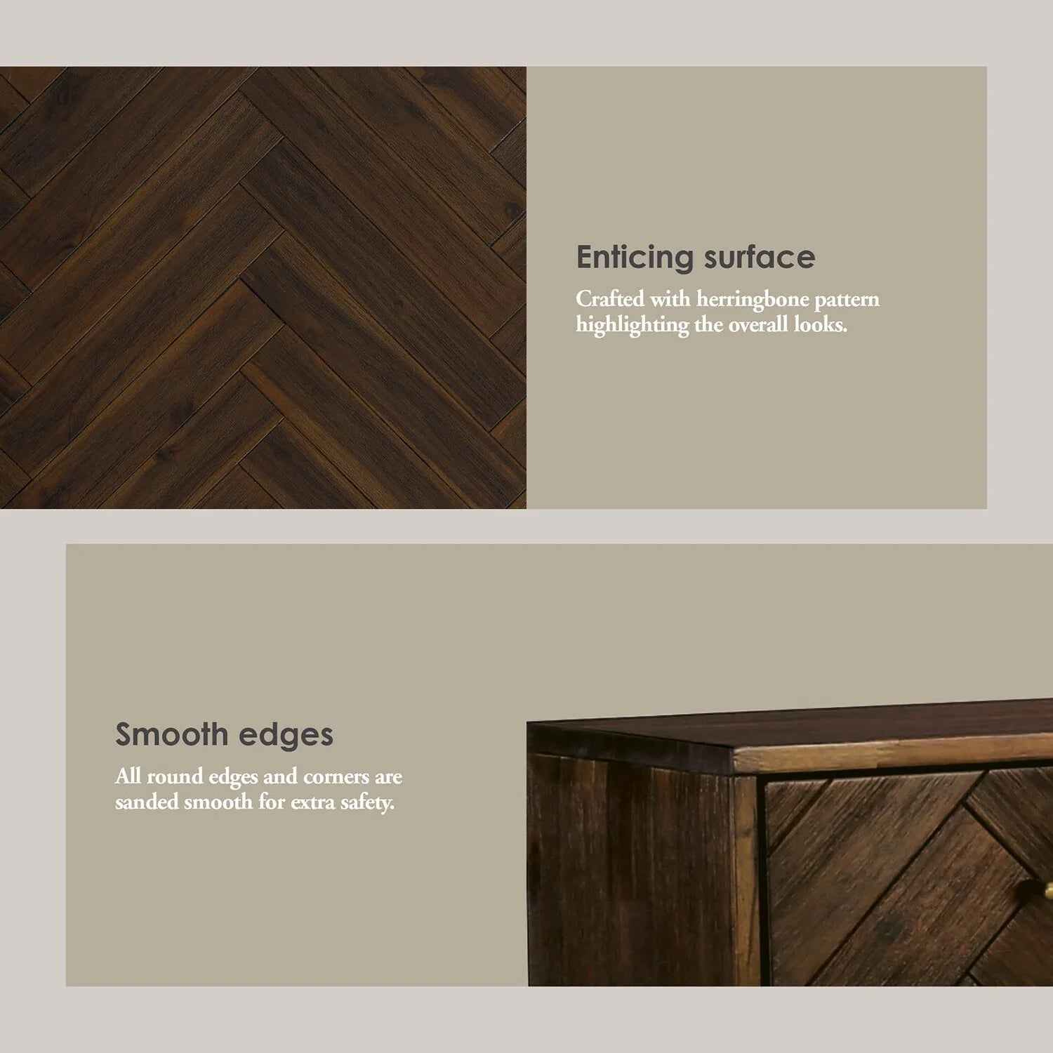 Product Key Features: Enticing surface Crafted with herringbone pattern highlighting the overall looks , Smooth edges All round edges and corners are sanded smooth for extra safety, Elegant handle The metal handle provides a good grip and easy access, Tapered legs Designed slanted and high from the ground, enhancing overall stability