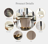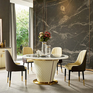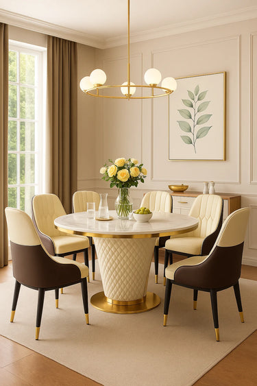 Elevate your dining area with the Marble Dining Table Set, a statement piece that blends modern style with timeless elegance. The round marble tabletop instantly adds sophistication, while the stainless steel base provides strength and stability. Paired with six upholstered chairs, this set offers both comfort and visual appeal.