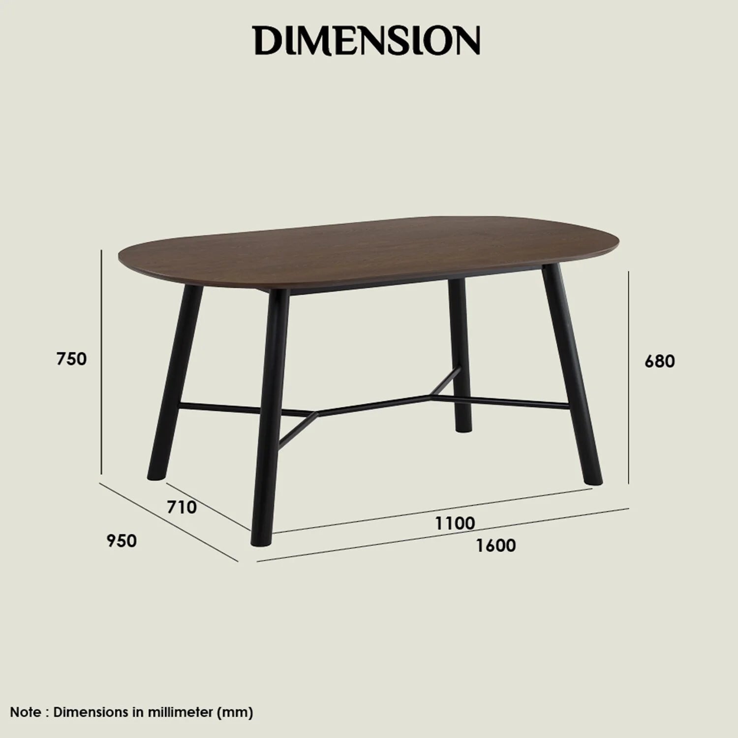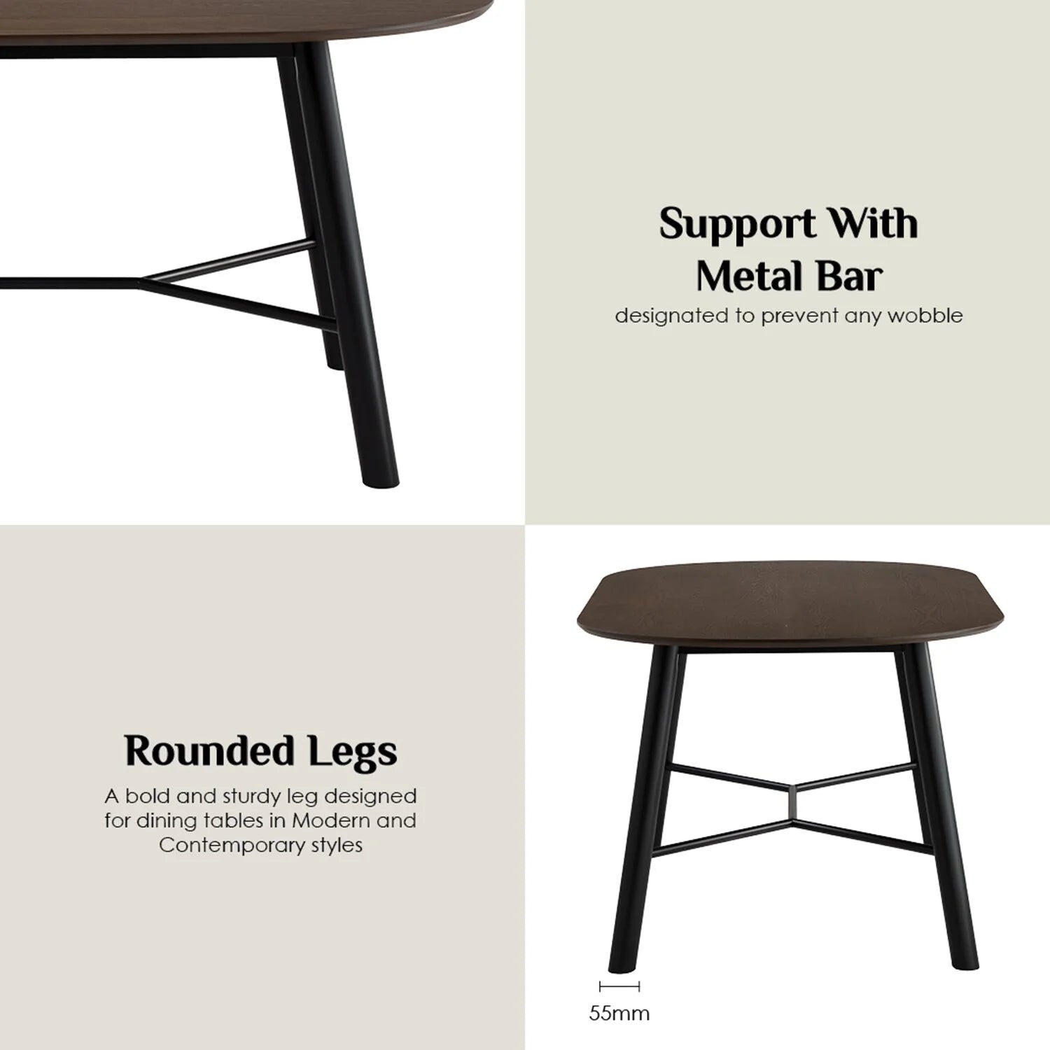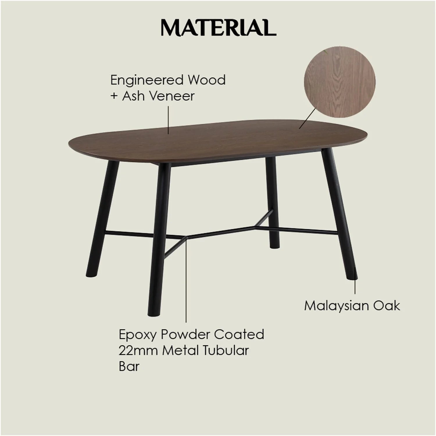 The tabletop is crafted from durable MDF with a natural ash veneer finish, giving it a warm, cocoa-toned appearance. The rounded legs, made from solid Malaysian oak, offer excellent support and a refined touch. Additionally, the central support bar, made of sturdy metal with a matte black epoxy finish, enhances stability and complements the overall design.