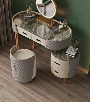 Elevate your bedroom with the luxurious La Bottega Vanity Set, crafted for those who value refined beauty and everyday functionality. This stunning piece blends a marble tabletop, covered in premium leather, and gold stainless-steel accents to create a vanity that feels both modern and timeless.