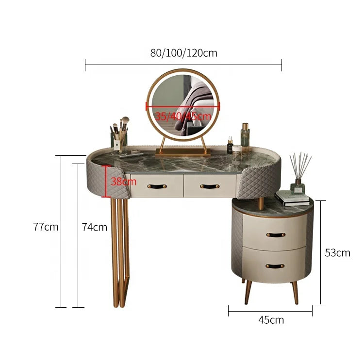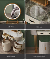 Designed with practicality in mind, the vanity includes a spacious storage drawer to keep your essentials organized and clutter-free. Completing the set is a comfortable padded stool that slides neatly underneath, along with a modern LED mirror featuring three lighting modes—perfect for precise makeup application and glowing selfies.