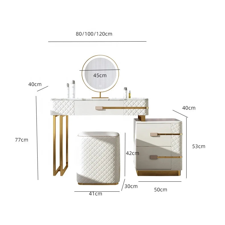 Designed with practicality in mind, the vanity includes a spacious four storage drawers to keep your essentials organized and clutter-free. Completing the set is a comfortable padded stool that slides neatly underneath, along with a modern LED mirror featuring three lighting modes—perfect for precise makeup application and glowing selfies.