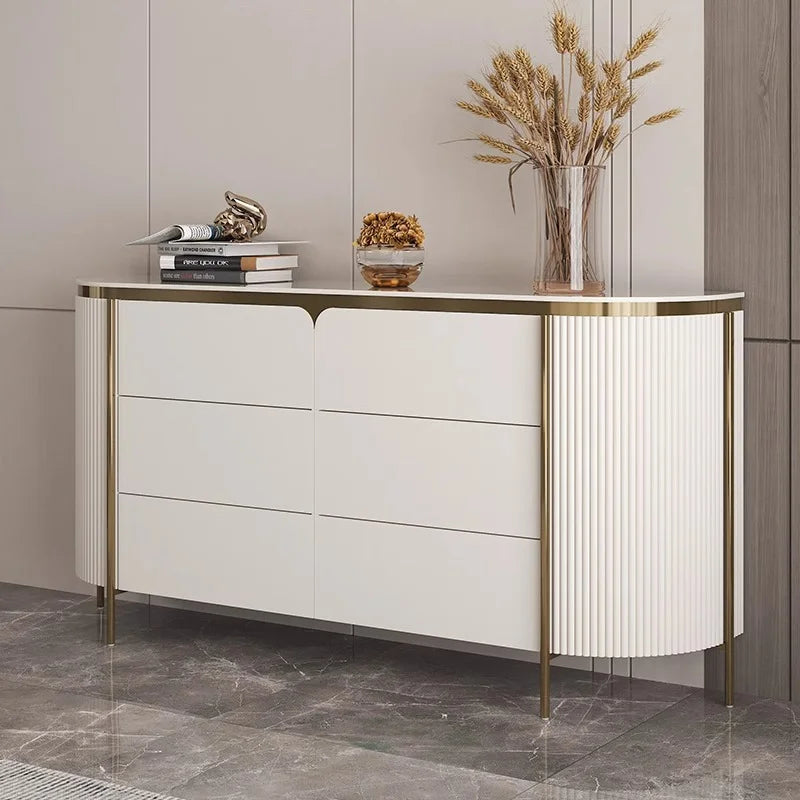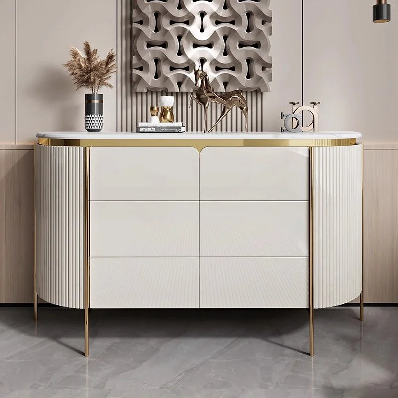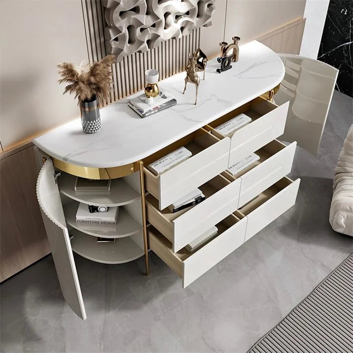 Elevate your space with the 1.6M Ophelia White Gold Marble Sideboard. Modern elegance meets premium craftsmanship in this striking piece. Crafted from high-quality wood with a luxurious marble and gold finish, it combines sleek style with durable construction. The sideboard offers versatile storage, ideal for dining, kitchen, or living areas.