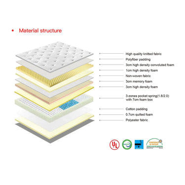 The mattress features a 3 zoned pocket spring system with 1.8mm and 2.0mm springs arranged in three zones. This system provides optimal support for your head, shoulders, hips, legs, and feet, enhancing your overall comfort. Furthermore, the pocket spring system includes a 7cm foam box, which significantly enhances the mattress's stability and edge support.