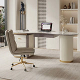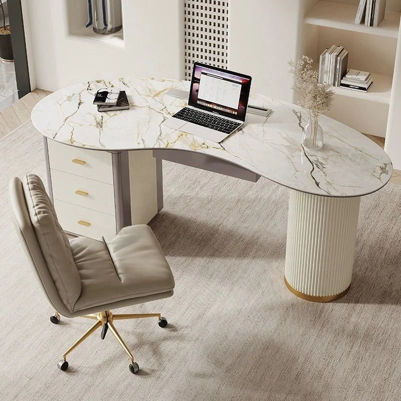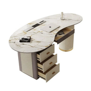 This modern Solid Marble Office Desk pairs refined aesthetics with everyday practicality. Featuring a 6mm Italy-imported rock slab tabletop, it offers a smooth, high-gloss surface that’s scratch-resistant and built to last. The 304 stainless steel gold-plated corners and elegant curved edges provide both impact resistance and a luxe, contemporary look. Designed for convenience, it includes a USB port and three-hole socket with a 210cm power cord, compatible with both floor and wall outlets—ideal for fast charging your devices during meals or meetings. Three solid pine wood drawers add natural warmth and practical storage to the base, while the table's sturdy build ensures long-term durability.