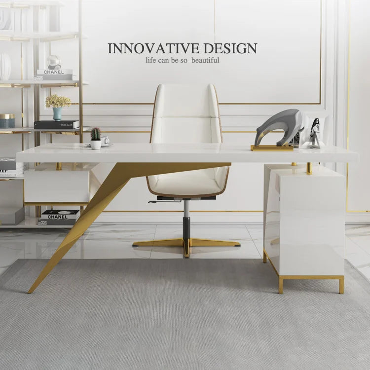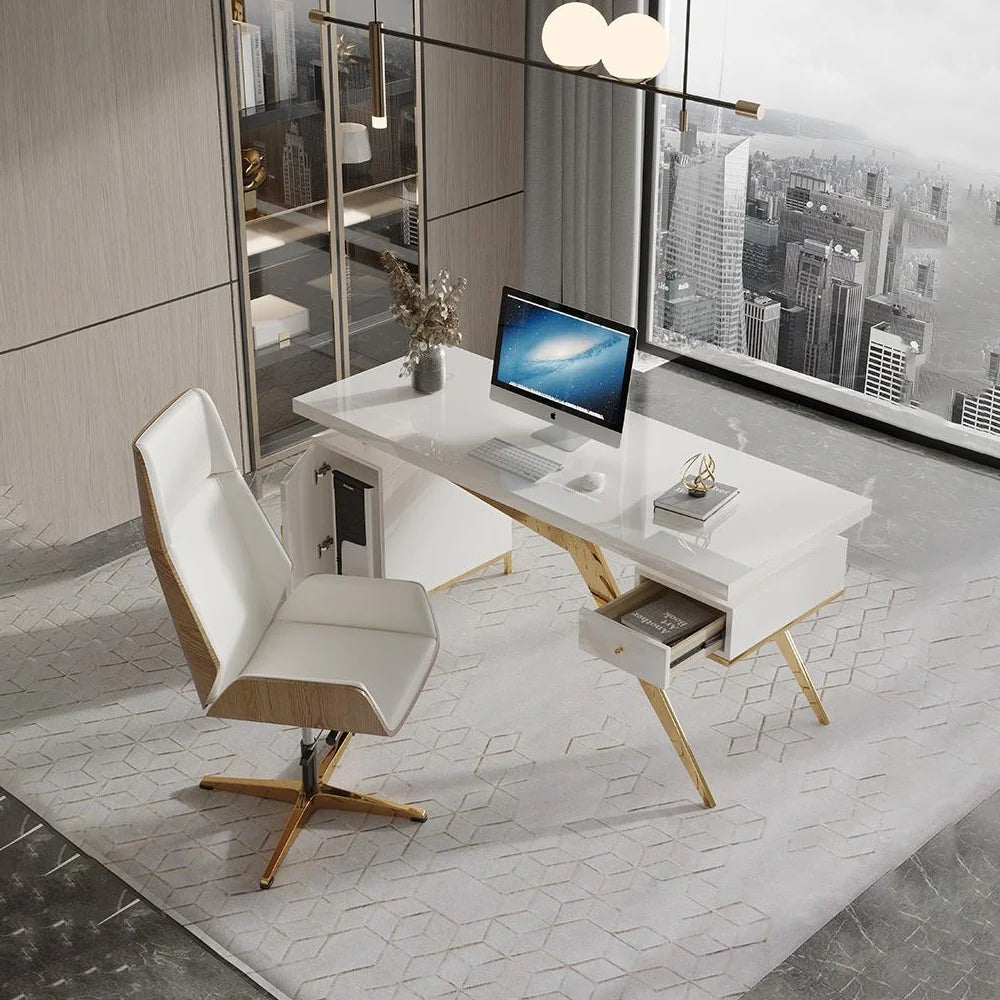 This modern Solid Marble Office Desk pairs refined aesthetics with everyday practicality. Featuring a 6mm Italy-imported rock slab tabletop, it offers a smooth, high-gloss surface that’s scratch-resistant and built to last. The 304 stainless steel gold-plated corners and elegant curved edges provide both impact resistance and a luxe, contemporary look. Designed for convenience, compatible with both floor and wall outlets—ideal for fast charging your devices during meals or meetings. Three solid pine wood drawers add natural warmth and practical storage to the base, while the table's sturdy build ensures long-term durability.
