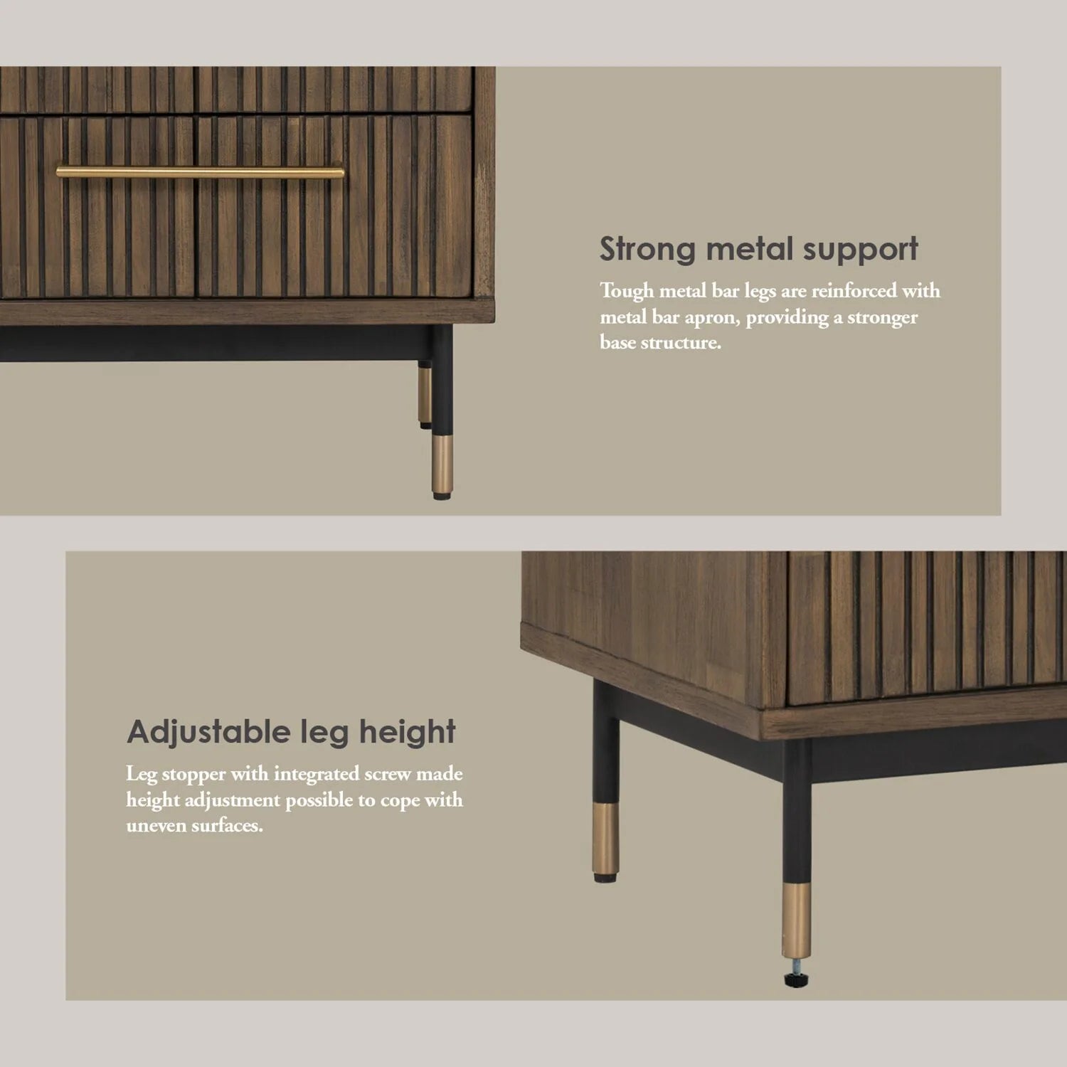 Product Key Features: Acacia veneer top Structurally strong with high scratch resistance, contributing to a longer-lasting end product , 3-layer ball bearing runner Provides a smoother movement and increases the extension length of the drawer. It remains strong and steady even when fully extended, Velvet covered drawer The top drawer comes with a soft, smooth touching velvet base, providing extra protection for delicate items, Finished back Tough back panel with matching colour and same wood stain finishing, enhancing its look and longevity, Strong metal support Tough metal bar legs are reinforced with metal bar apron, providing a stronger base structure, Adjustable leg height Leg stopper with integrated screw made height adjustment possible to cope with uneven surfaces