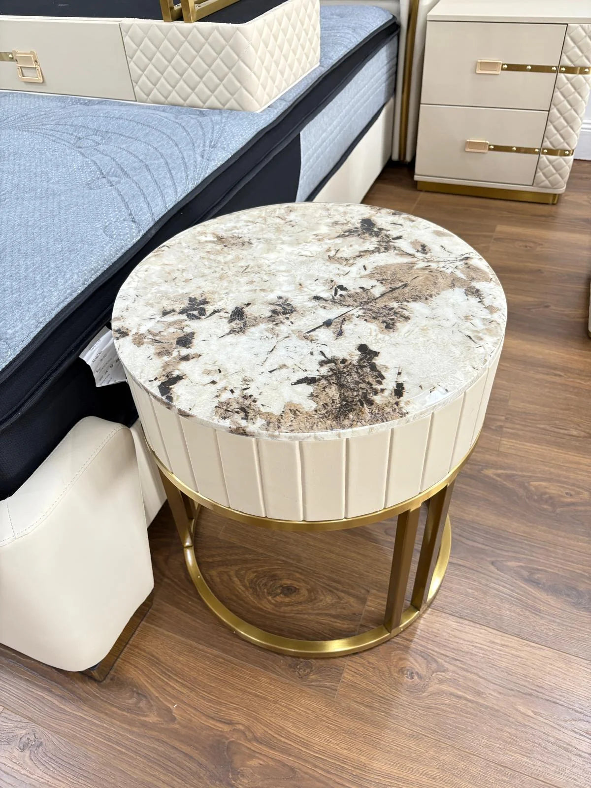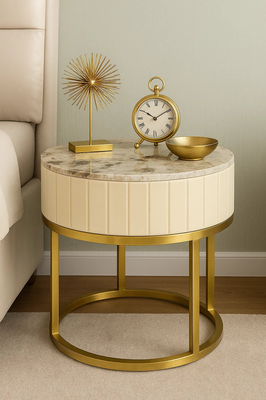Refined elegance meets everyday function with the Marble Top Leather Side Table. Designed to elevate modern bedrooms and living spaces, this piece features a solid marble stone top paired with soft beige leather upholstery and gold-toned metal accents, delivering a look that is both timeless and luxurious.