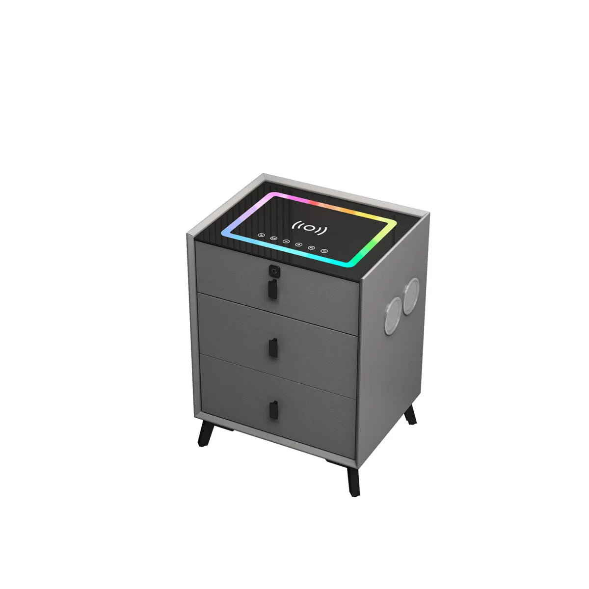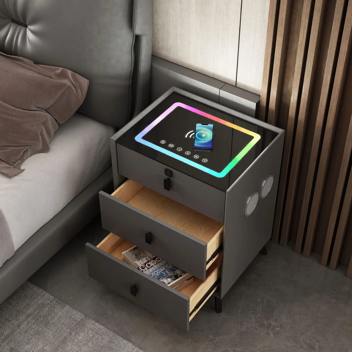 Why settle for separate gadgets when your nightstand can do it all? RGB lighting, wireless & USB charging, Bluetooth speakers, and fingerprint-secured storage are combined into one sleek, modern piece. Crafted from solid wood and premium dark gray leather, it brings luxury, convenience, and security to your bedside.