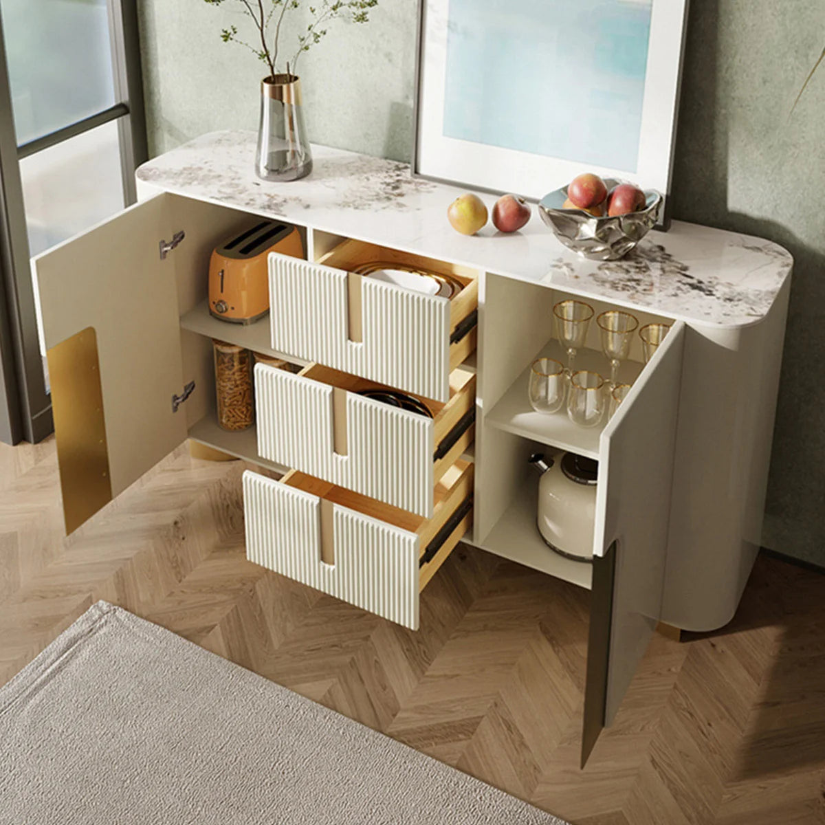 Designed for practicality, this Sisdeboard includes 4 spacious drawers and 3 additional storage compartments with doors, offering generous room for daily essentials while maintaining a clean, organized look.