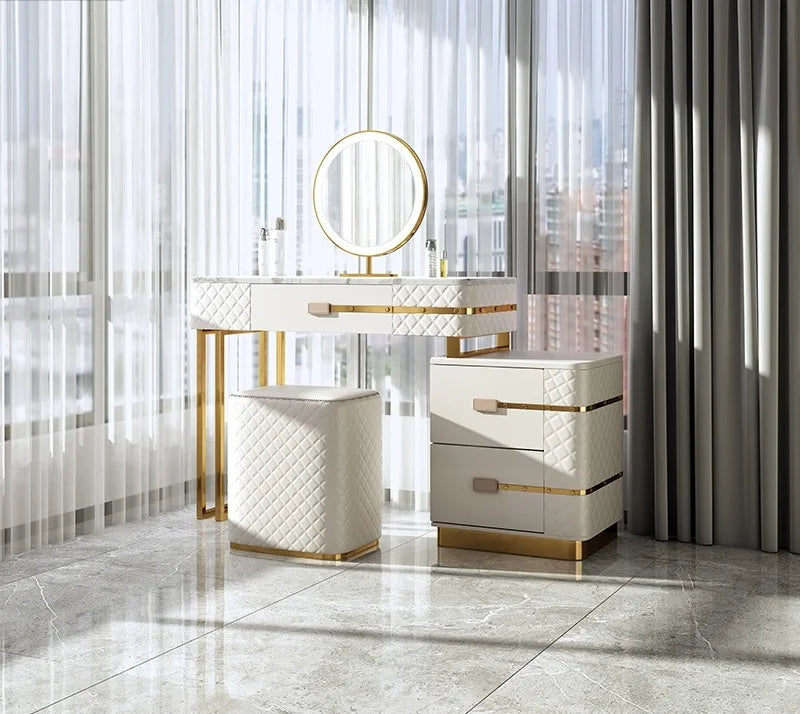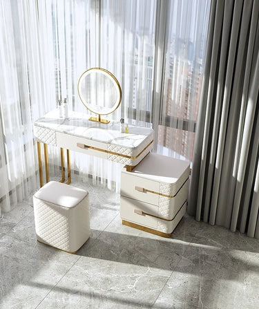 Elevate your bedroom with the luxurious La Parisienne 3 Piece Vanity Set, crafted for those who value refined beauty and everyday functionality. This stunning piece blends a white marble tabletop, covered in microfiber leather, and gold stainless-steel accents to create a vanity that feels both modern and timeless.