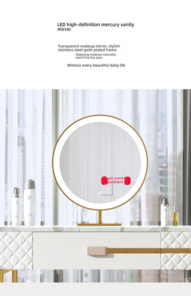 Designed with practicality in mind, the vanity includes a spacious four storage drawers to keep your essentials organized and clutter-free. Completing the set is a comfortable padded stool that slides neatly underneath, along with a modern LED mirror featuring three lighting modes—perfect for precise makeup application and glowing selfies.
