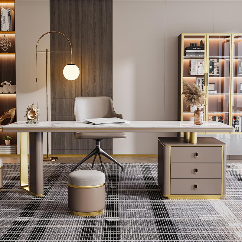 This modern Solid Marble Office Desk pairs refined aesthetics with everyday practicality. Featuring a 6mm Italy-imported rock slab tabletop, it offers a smooth, high-gloss surface that’s scratch-resistant and built to last. The 304 stainless steel gold-plated corners and elegant curved edges provide both impact resistance and a luxe, contemporary look. Designed for convenience, it includes a USB port and three-hole socket with a 210cm power cord, compatible with both floor and wall outlets—ideal for fast charging your devices during meals or meetings. Three solid pine wood drawers add natural warmth and practical storage to the base, while the table’s sturdy build ensures long-term durability.
