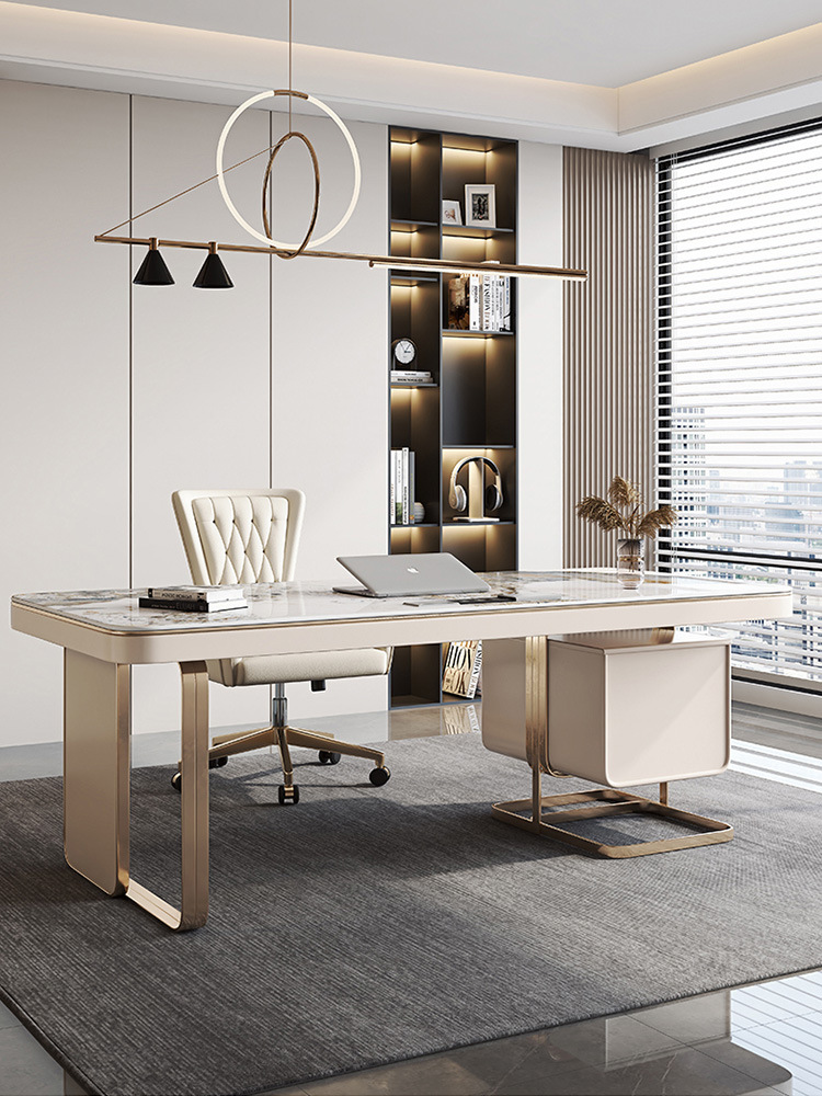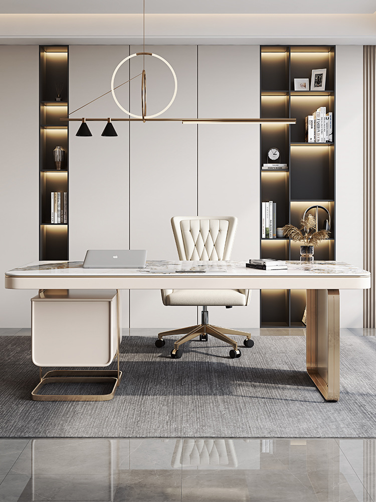 This versatile desk blends elegance and practicality with its golden stainless steel frame, high-gloss sintered stone countertop, and piano lacquer finishes. Designed for both work and leisure, it features a humanized lift lid, built-in USB port, and dual sockets with hidden cable routing for a clean, modern setup. The E1-grade eco-friendly board and 4C piano baking varnish ensure a scratch-resistant, moisture-proof, and low-odor surface. With a spacious dual-drawer system, silent slide hardware, and solid pine open shelving, this desk is built for durability, style, and seamless function—perfect for office productivity.