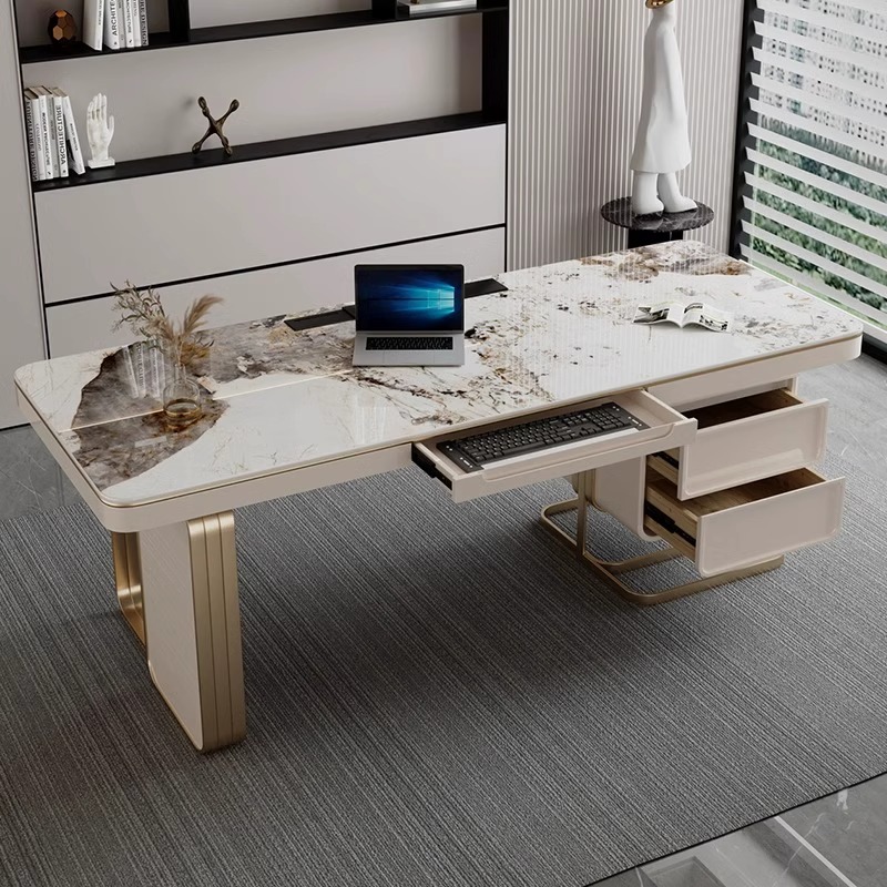 This modern Solid Marble Office Desk pairs refined aesthetics with everyday practicality. Featuring a 6mm Italy-imported rock slab tabletop, it offers a smooth, high-gloss surface that’s scratch-resistant and built to last. The 304 stainless steel gold-plated corners and elegant curved edges provide both impact resistance and a luxe, contemporary look. Designed for convenience, it includes a USB port and three-hole socket with a 210cm power cord, compatible with both floor and wall outlets—ideal for fast charging your devices during meals or meetings. Three solid pine wood drawers add natural warmth and practical storage to the base, while the table’s sturdy build ensures long-term durability.