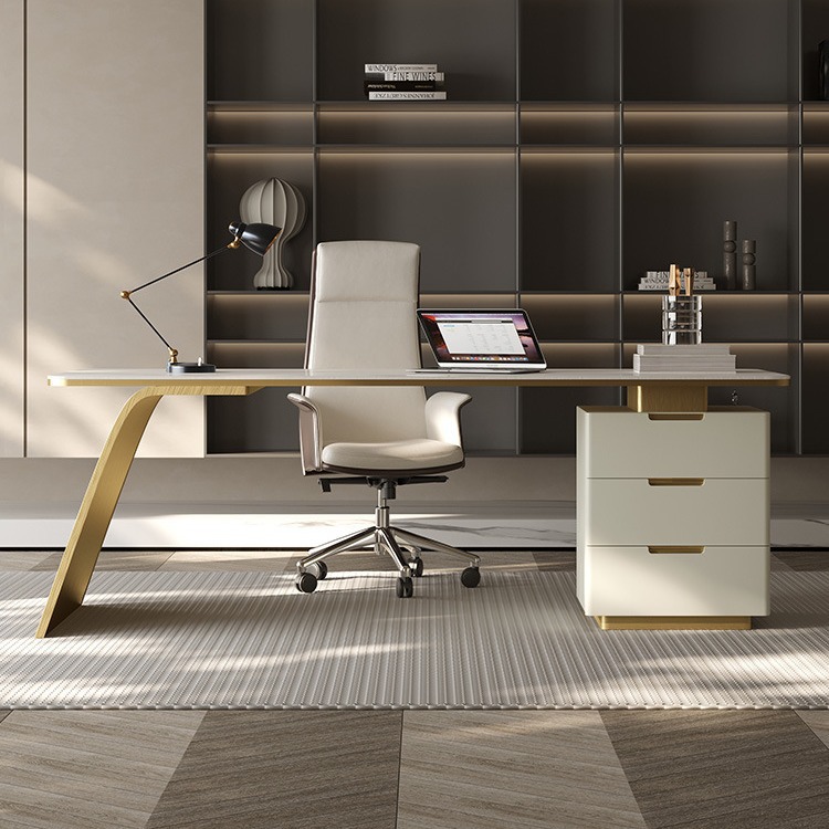 This versatile desk blends elegance and practicality with its golden stainless steel frame, high-gloss sintered stone countertop, and piano lacquer finishes. Designed for both work and leisure, it features a humanized lift lid, built-in USB port, and dual sockets with hidden cable routing for a clean, modern setup. The E1-grade eco-friendly board and 4C piano baking varnish ensure a scratch-resistant, moisture-proof, and low-odor surface. With a spacious dual-drawer system, silent slide hardware, and solid pine open shelving, this desk is built for durability, style, and seamless function—perfect for office productivity.