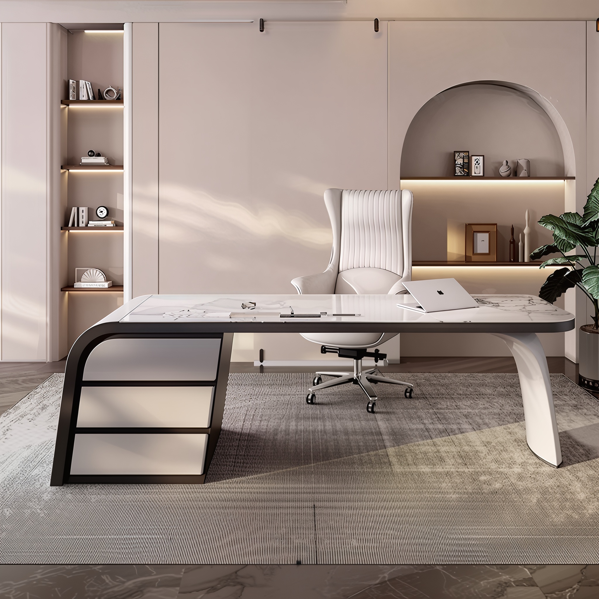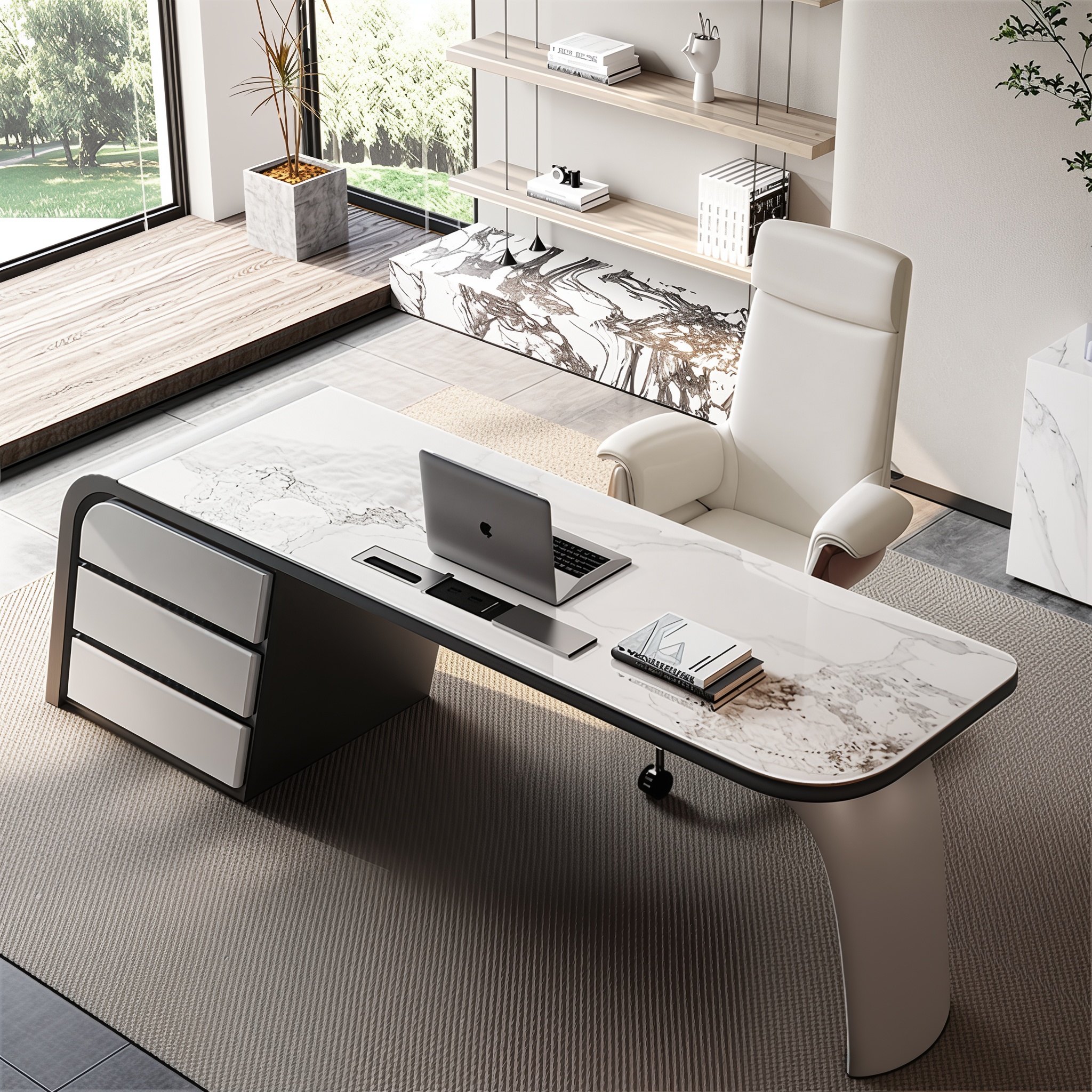 Elevate your workspace with this luxury marble-top executive desk, designed to blend sophistication with smart functionality. Featuring a premium 6mm Turkey-imported sintered stone surface, the high-gloss white top is scratch-resistant, heat-resistant, and effortlessly elegant—perfect for both professional offices and refined home studies.