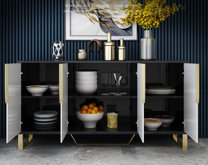 With four doors and multiple internal shelves, this cabinet offers generous storage while maintaining a clean, uncluttered look. Its modern design and elegant gold accents make it suitable for use as a sideboard, buffet cabinet, media console, or storage unit in dining rooms, living areas, offices, apartments, and hotels.
