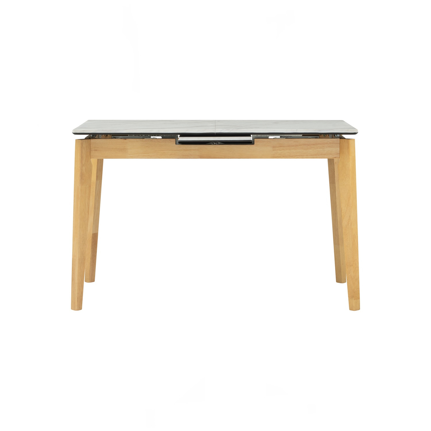 Combines modern industrial style with practical versatility, featuring a sleek white marble high-pressure laminate tabletop and sturdy solid rubberwood legs in natural finish.
