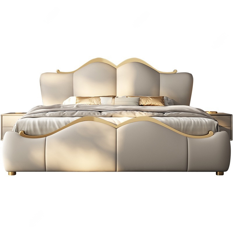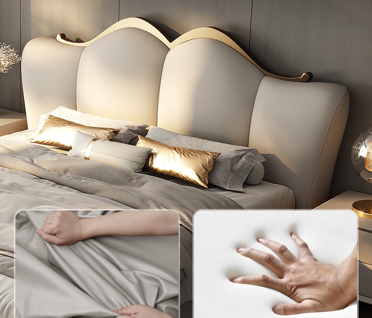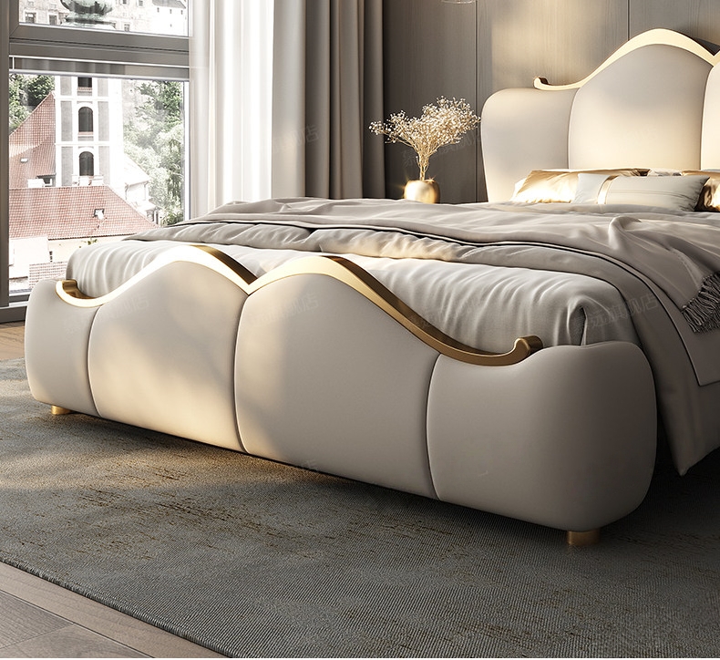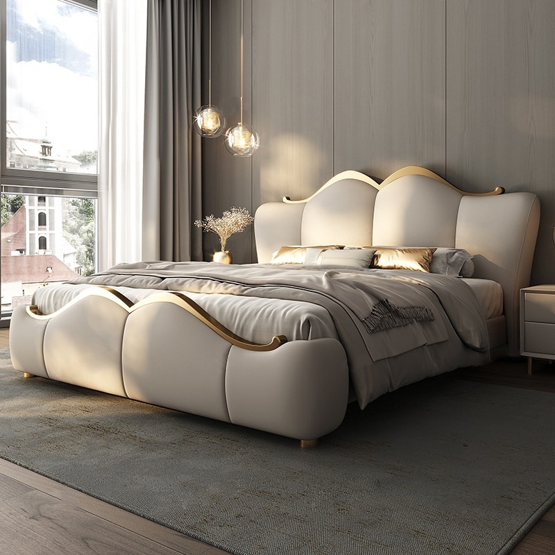 Its gracefully curved silhouette adds a soft, artistic touch, creating a statement of refined elegance that enhances any bedroom interior. The bed is elevated with titanium-plated accents, offering a sleek, modern finish that is resistant to corrosion, fading, and everyday wear, ensuring lasting beauty over time.