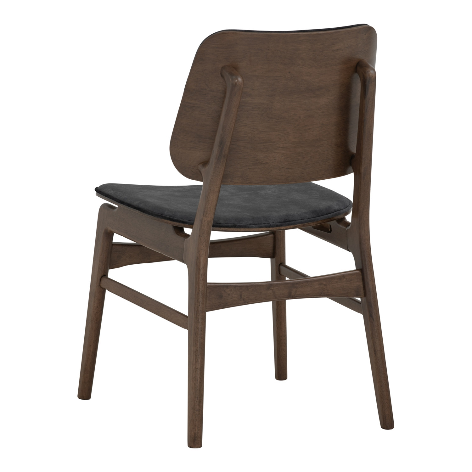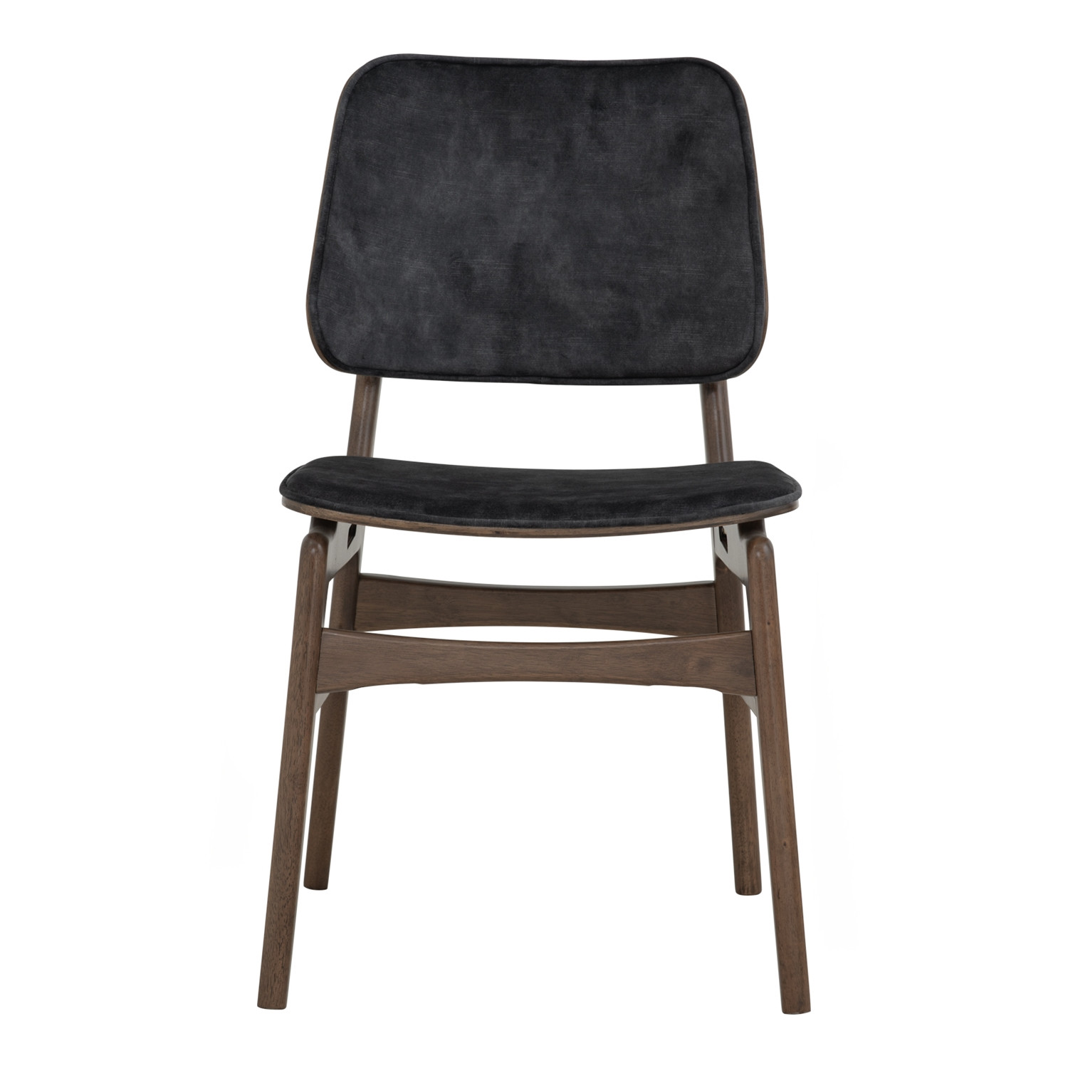 Heath Dining Chair with Cocoa colour leg, Black colour Arctus fabric. The Heath Dining Chair brings a balance of modern design and mid-century influence. Its cocoa oak legs pair beautifully with a black bentwood back and seat, both upholstered in Arctus fabric. This mix of textures creates depth and style. The ergonomic shape ensures comfort for long meals. A refined choice for modern dining interiors.