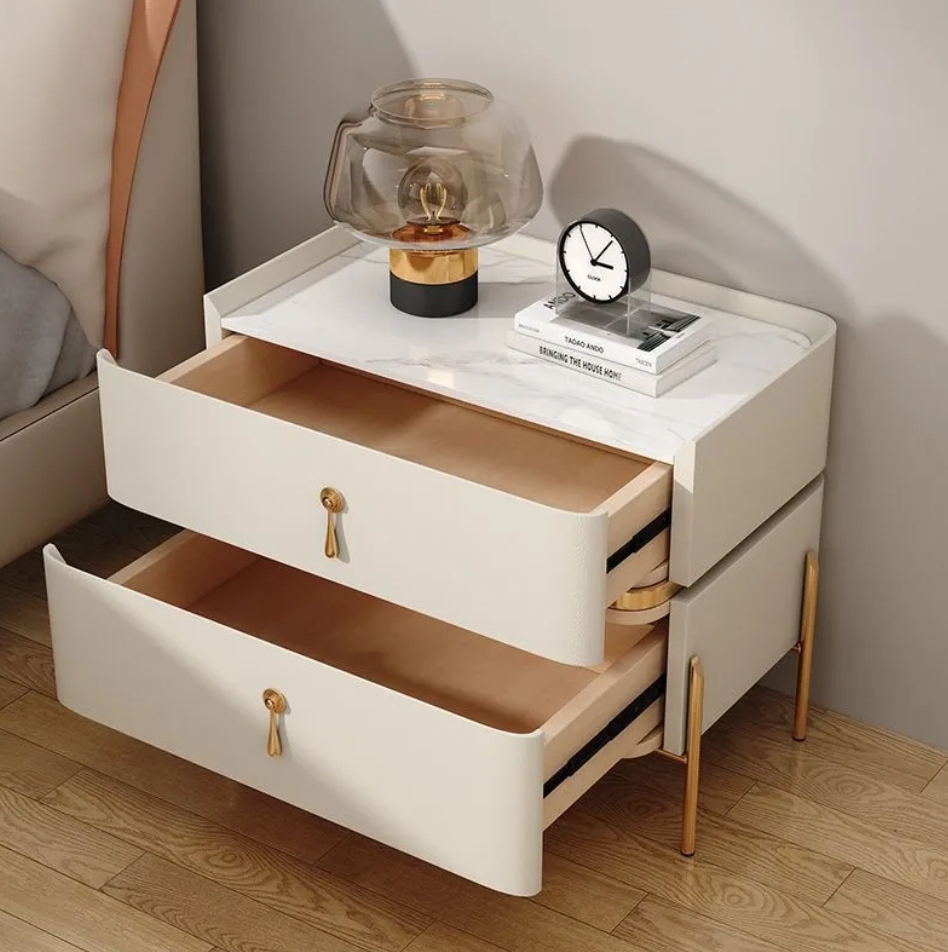 This elegant nightstand features a champagne-luster stainless steel frame with a smooth electroplated finish for a luxurious touch. Its super crystalline stone top offers stunning texture, scratch resistance, and stability, while the silent slide drawers ensure smooth, durable functionality. A perfect blend of beauty and practicality.