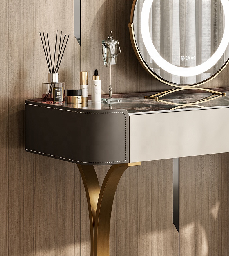 Elevate your bedroom with the luxurious La Madrid Vanity Set, crafted for those who value refined beauty and everyday functionality. This stunning piece blends a marble tabletop, covered in premium leather, and gold stainless-steel accents to create a vanity that feels both modern and timeless.