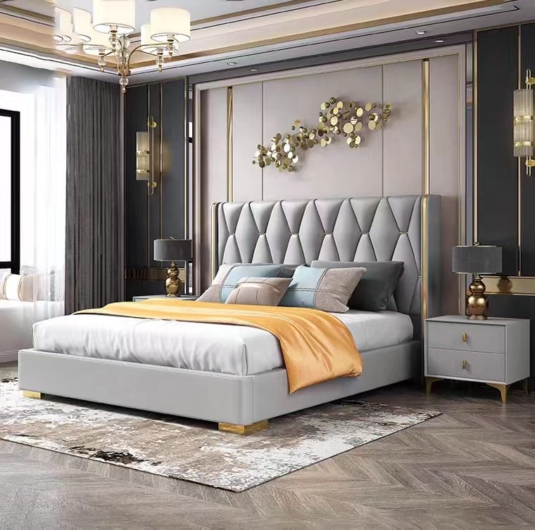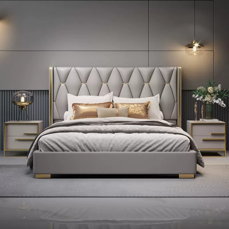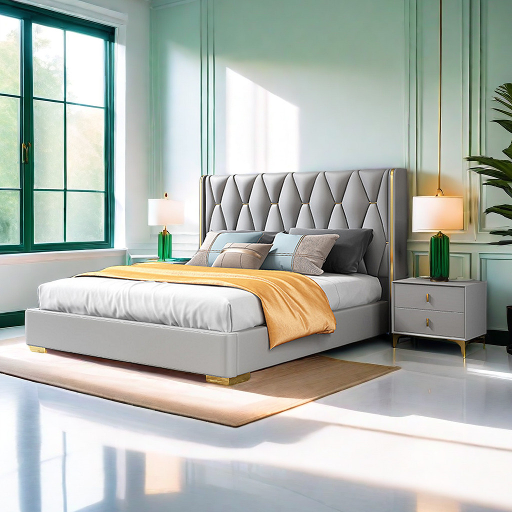 Its gracefully curved silhouette adds a soft, artistic touch, creating a statement of refined elegance that enhances any bedroom interior. The bed is elevated with titanium-plated accents, offering a sleek, modern finish that is resistant to corrosion, fading, and everyday wear, ensuring lasting beauty over time.