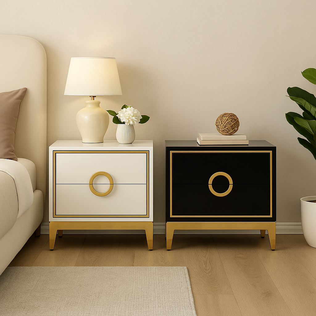 Elevate your bedroom with the Marble Top Leather Side Table. This stylish piece features a sleek Beige Leather finish with gold-toned metal accents, creating a modern and luxurious look.