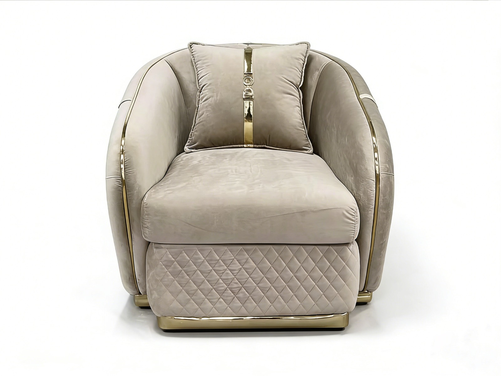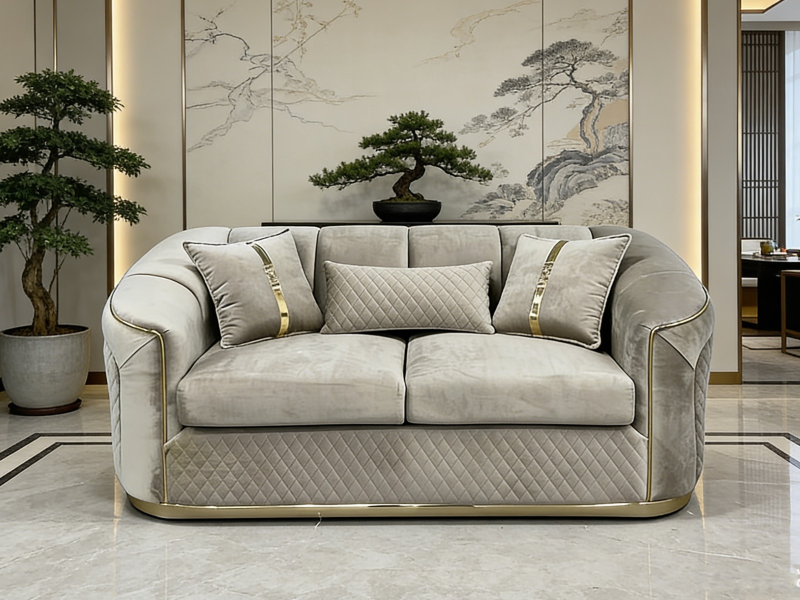 Beneath its elegant exterior, strength and stability are ensured by a solid wood internal frame, reinforced with serpentine spring suspension for superior resilience and shape retention. Finished with gold-plated stainless-steel feet, the sofa offers both visual brilliance and long-term corrosion resistance.