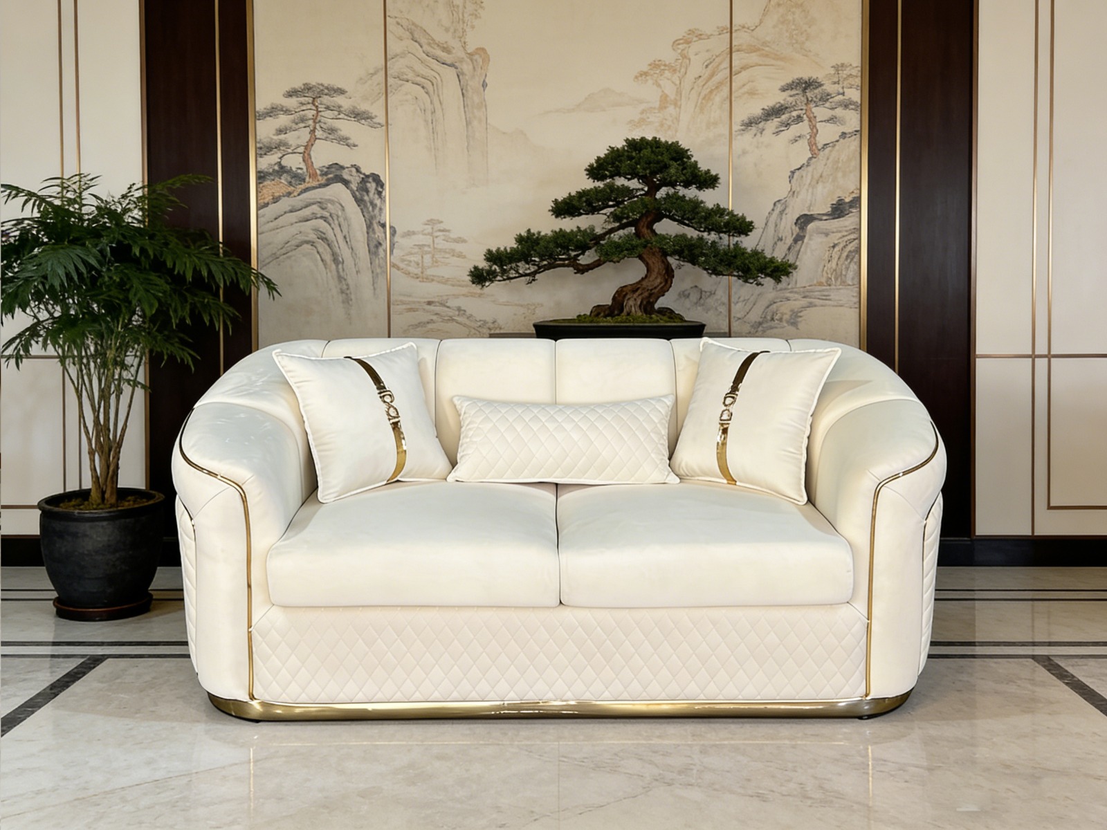 Beneath its elegant exterior, strength and stability are ensured by a solid wood internal frame, reinforced with serpentine spring suspension for superior resilience and shape retention. Finished with gold-plated stainless-steel feet, the sofa offers both visual brilliance and long-term corrosion resistance.