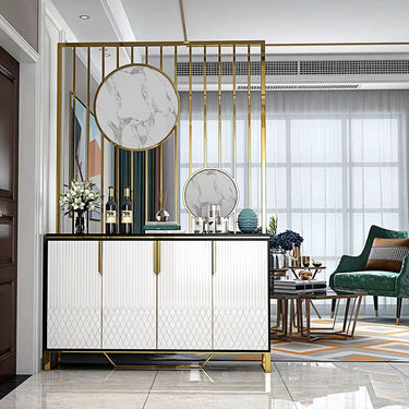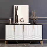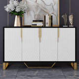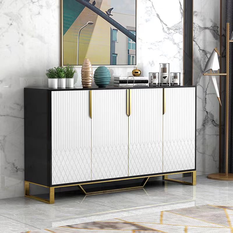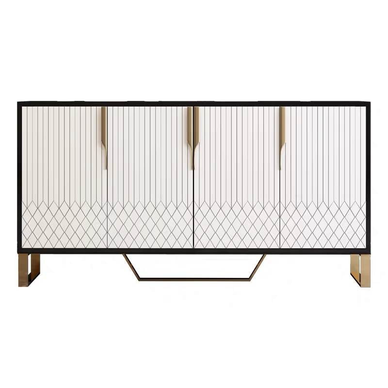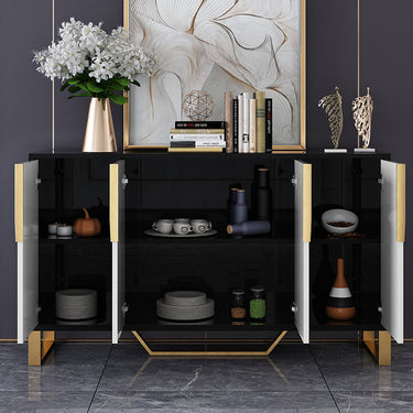 With four doors and multiple internal shelves, this cabinet offers generous storage while maintaining a clean, uncluttered look. Its modern design and elegant gold accents make it suitable for use as a sideboard, buffet cabinet, media console, or storage unit in dining rooms, living areas, offices, apartments, and hotels.