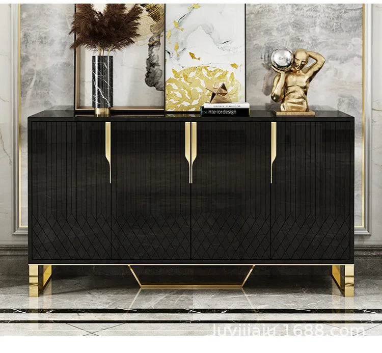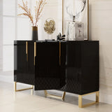 With four doors and multiple internal shelves, this cabinet offers generous storage while maintaining a clean, uncluttered look. Its modern design and elegant gold accents make it suitable for use as a sideboard, buffet cabinet, media console, or storage unit in dining rooms, living areas, offices, apartments, and hotels.
