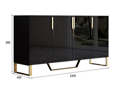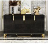 The Throne Sideboard Cabinet is a sleek and versatile storage piece designed for both style and functionality. Crafted from gold-toned stainless steel, wood, and a full tempered glass top, it features a high-gloss black finish that adds a refined, modern touch to any space.