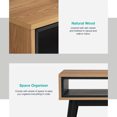 Castor Coffee Table in Natural Ash veneer top, Space Blue colour drawer with Black colour leg. The Castor Coffee Table showcases Mid-Century Modern flair with a touch of Art Deco influence. Crafted with Malaysian oak legs, it pairs a black-toned frame with a natural wood accent and a unique blue shelf. The layered combination of finishes adds depth and character, making it a standout feature in any room. Its rectangular shape provides practicality while maintaining a sleek profile. The mix of warm, neutral, and bold tones allows it to complement both classic and contemporary spaces. A versatile piece designed for style-conscious homes.