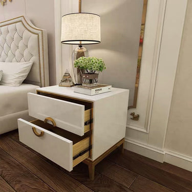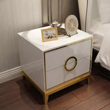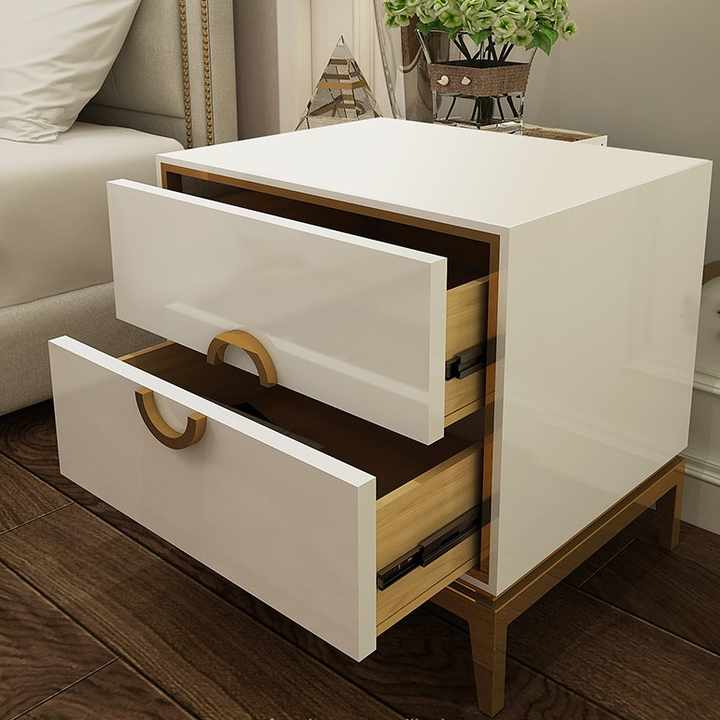 The high-gloss surface paired with a brushed gold metal frame creates a sophisticated look that complements contemporary, modern, and luxury bedroom interiors. Featuring two spacious drawers, it provides convenient storage for books, glasses, and nighttime essentials while keeping your space neat and organized.