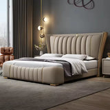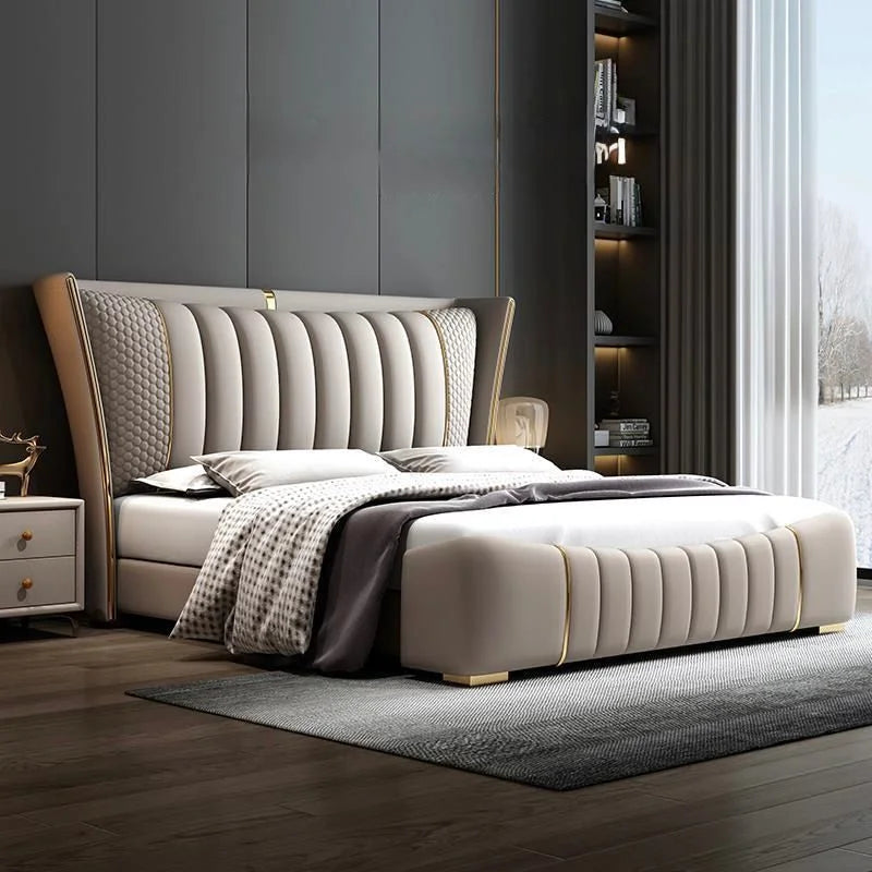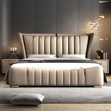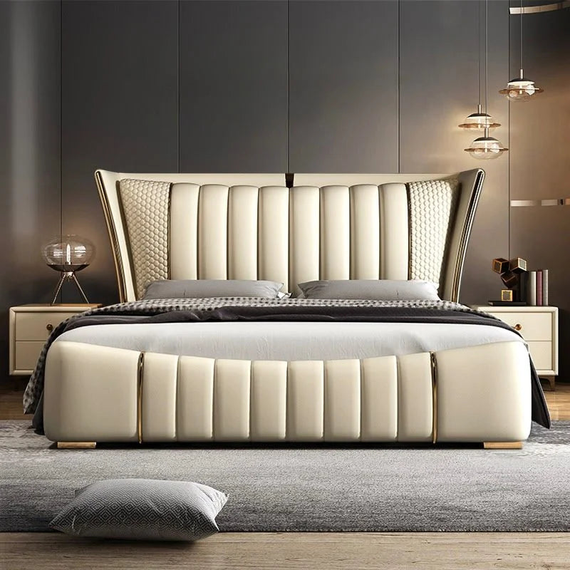 Its gracefully curved silhouette adds a soft, artistic touch, creating a statement of refined elegance that enhances any bedroom interior. The bed is elevated with titanium-plated accents, offering a sleek, modern finish that is resistant to corrosion, fading, and everyday wear, ensuring lasting beauty over time.