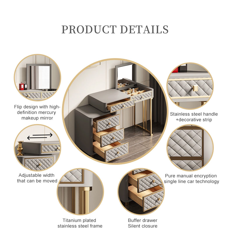 Completing the set is a comfortably padded matching stool that slides neatly underneath for a seamless, space-saving look, along with a modern LED mirror featuring three adjustable lighting modes — ideal for flawless makeup application, skincare routines, or capturing the perfect glow.