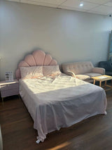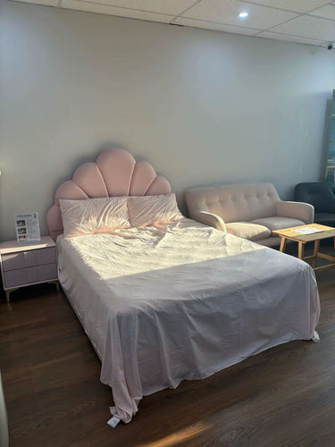 A Complete Set of an Upgraded 4 Piece Bedroom Suite of a Queen Leather Bedframe with Rose Linen 2 Seater Sofa and 2 Matching Leather Nightstands