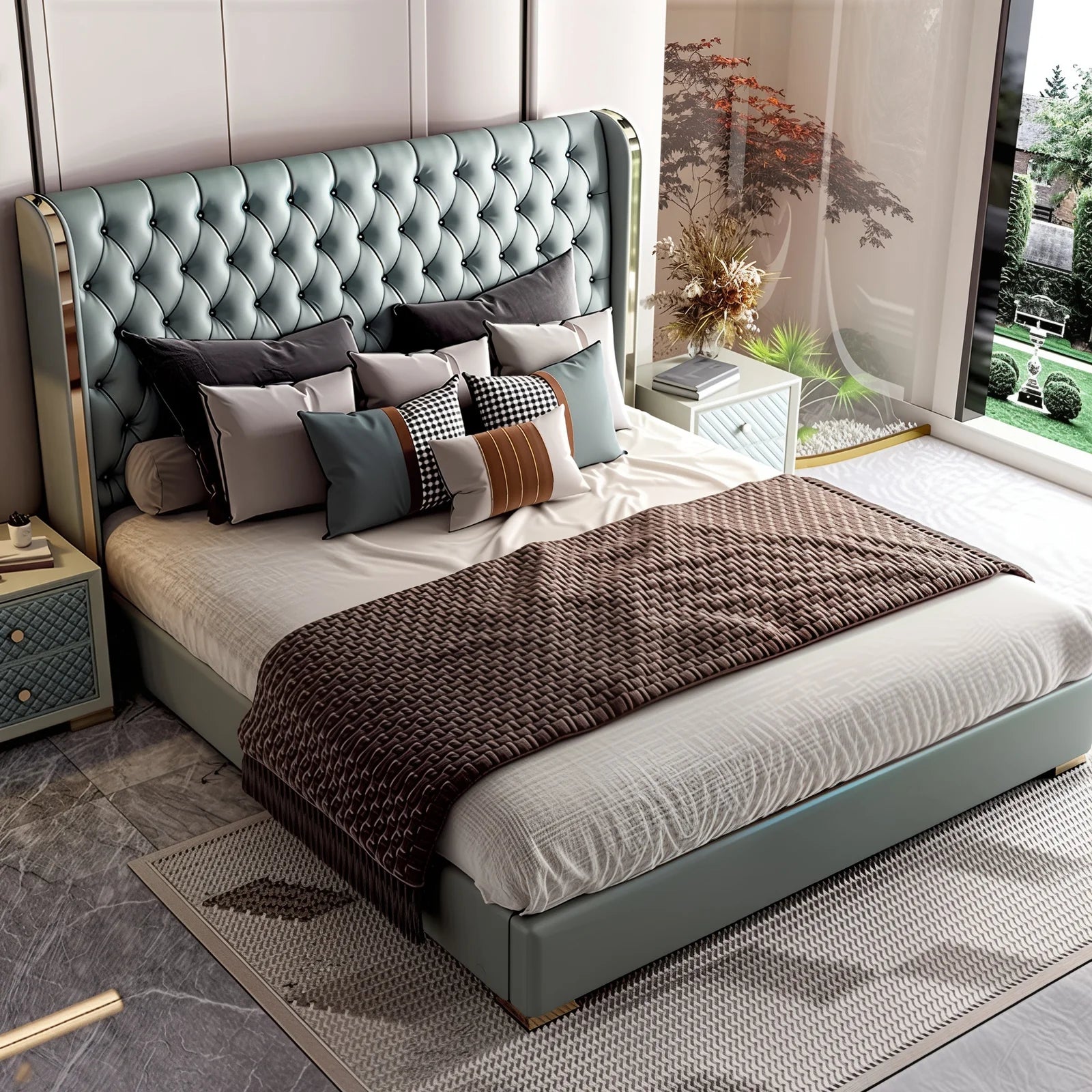 Its gracefully curved silhouette adds a soft, artistic touch, creating a statement of refined elegance that enhances any bedroom interior. The bed is elevated with titanium-plated accents, offering a sleek, modern finish that is resistant to corrosion, fading, and everyday wear, ensuring lasting beauty over time.