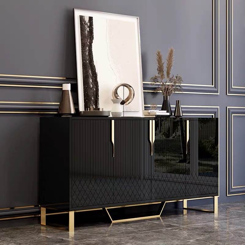 The Throne Sideboard Cabinet is a sleek and versatile storage piece designed for both style and functionality. Crafted from gold-toned stainless steel, wood, and a full tempered glass top, it features a high-gloss black finish that adds a refined, modern touch to any space.